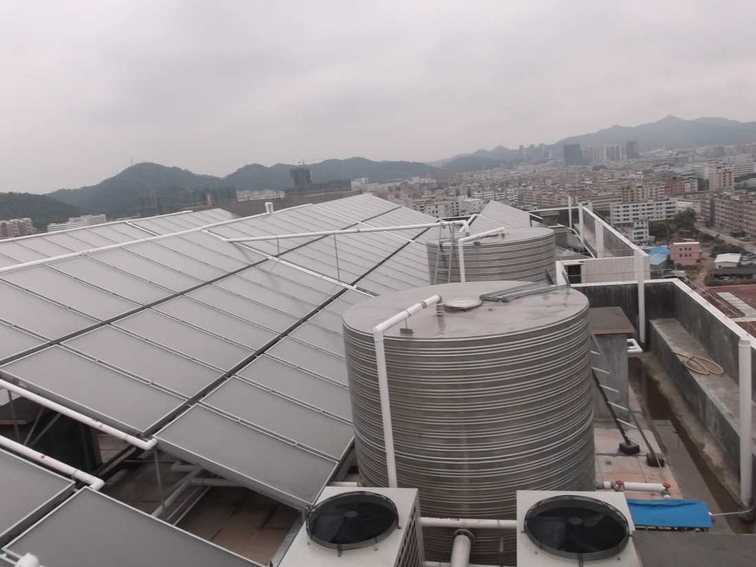 TCL王牌電器(惠州)有限公司員工公寓安裝560㎡平板太陽能與12臺空氣源熱泵互補的集中供熱水系統。為該公寓每天為員工供應90噸熱水,滿足1600人的熱水洗浴需求。