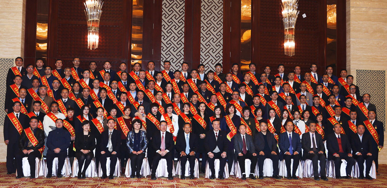 “全國輕工行業勞動模范”榮譽稱號獲得者和與會領導合影留念。
