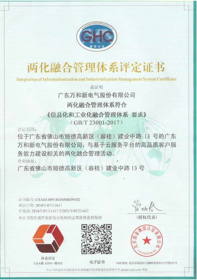 4月11日-4月13日,北京國金衡信認證有限公司評審專家組對廣東萬和新電氣股份有限公司進行了新版《信息化和工業化融合管理體系 要求》(GB/T23001-2017)及新型能力“基于云服務平臺的高品質客戶服務能力”審核。經過3天緊張的現場評估審核,公司順利通過了現場評審,并被推薦到評定機構以做出評定結論,6月25日通過了兩化融合管理體系評定管理平臺專家復核,7月正式下發新版《兩化融合管理體系評定證書》。