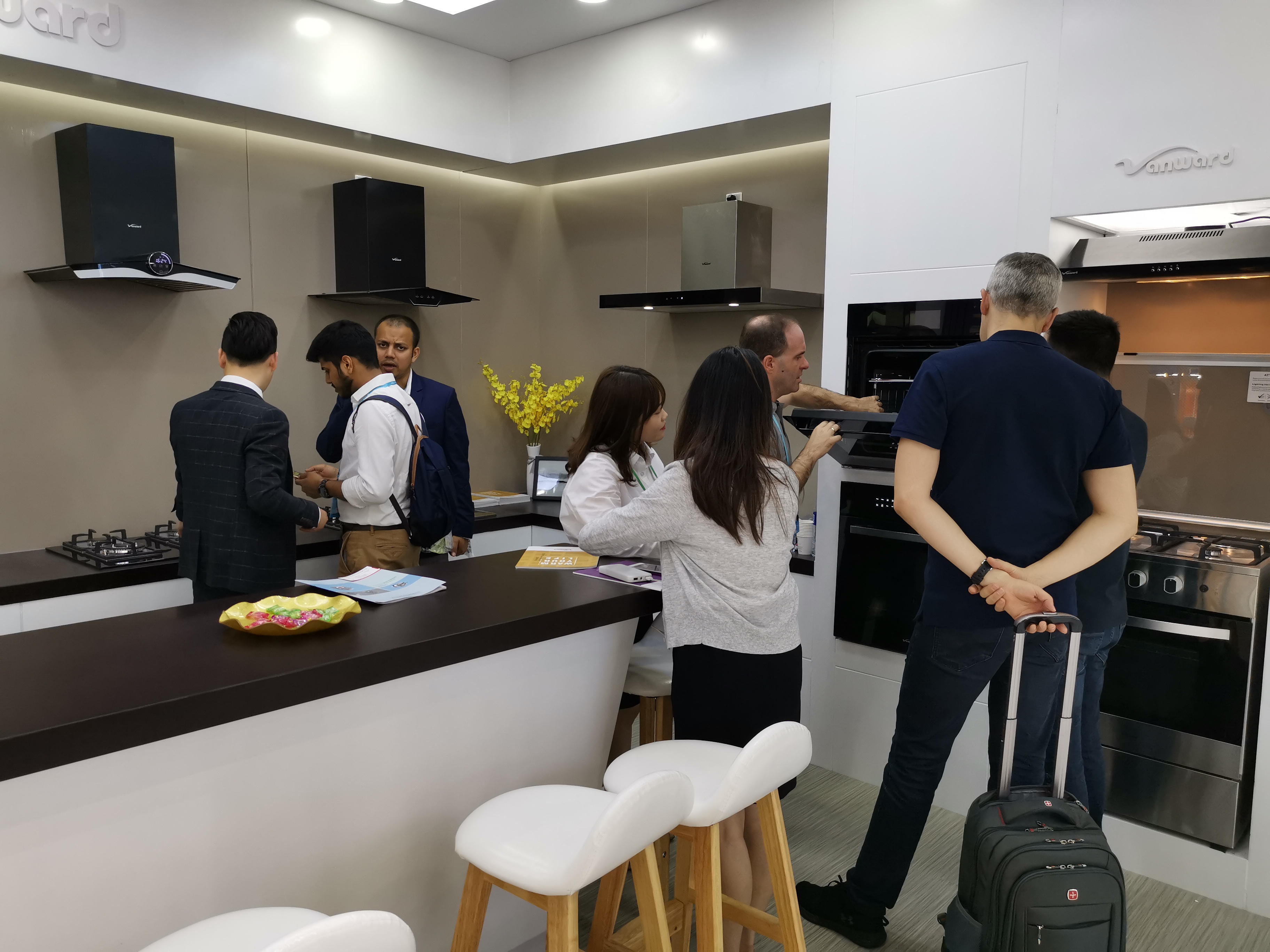 海外客商在萬和的廚電產品展區及烤爐產品展區了解產品。