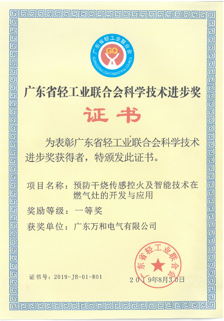 近日,廣東省輕工業聯合會正式公布了2019年科技進步獎評選結果,由廣東萬和電氣有限公司(廣東萬和新電氣股份有限公司子公司)研發的“預防干燒傳感控火及智能技術在燃氣灶的開發與應用”項目榮獲廣東輕工聯2019年科學技術進步獎一等獎。