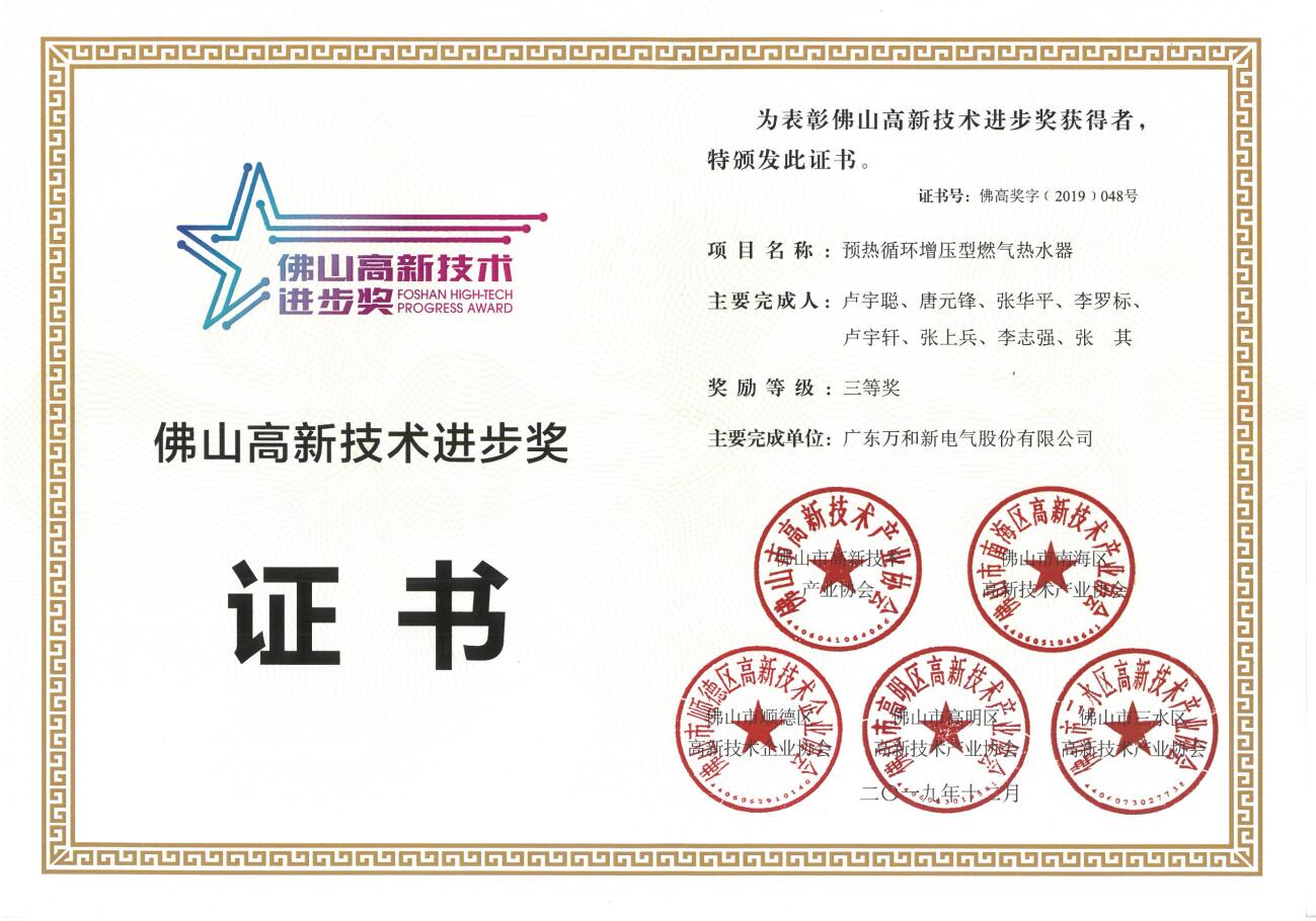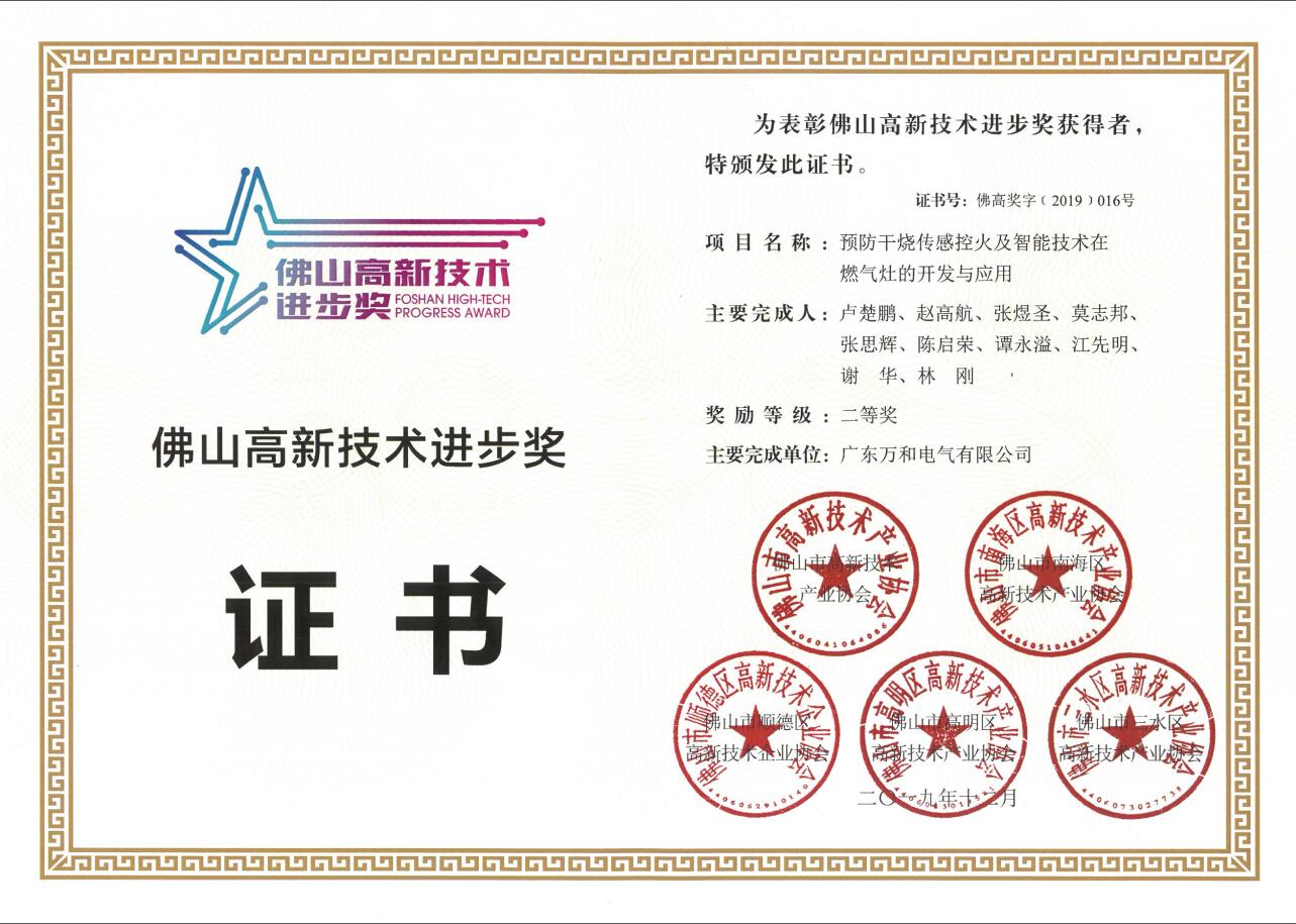 1月8日,佛山市高新技術產業協會聯合各區高新協會共同主辦的第二屆佛山高新技術進步獎表彰大會在佛山中歐中心國際會議中心舉行,共有58個項目獲得第二屆“佛山高新技術進步獎”,廣東萬和新電氣股份有限公司及子公司廣東萬和電氣有限公司各有一項技術獲獎。