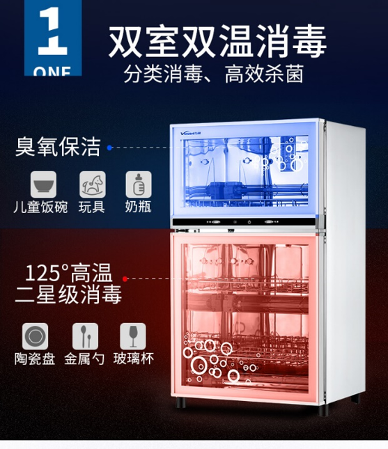 它采用雙室雙溫消毒:上層為臭氧保潔,能夠快速殺死細菌,同時迅速烘干餐具殘留的水分,抑制細菌滋生,適合寶寶的兒童飯碗、奶嘴、玩具等這類不耐高溫的器皿;而下層采用紅外線高溫消毒,利用125℃高溫,滲透餐具表面每個角落,消滅頑固病菌。這種高溫消毒的方式更適合陶瓷、不銹鋼、玻璃等耐高溫器皿。而它也具備大容量的優勢,把家里的餐具全都放心交給它,從此遠離細菌病毒,飲食安全有保障。