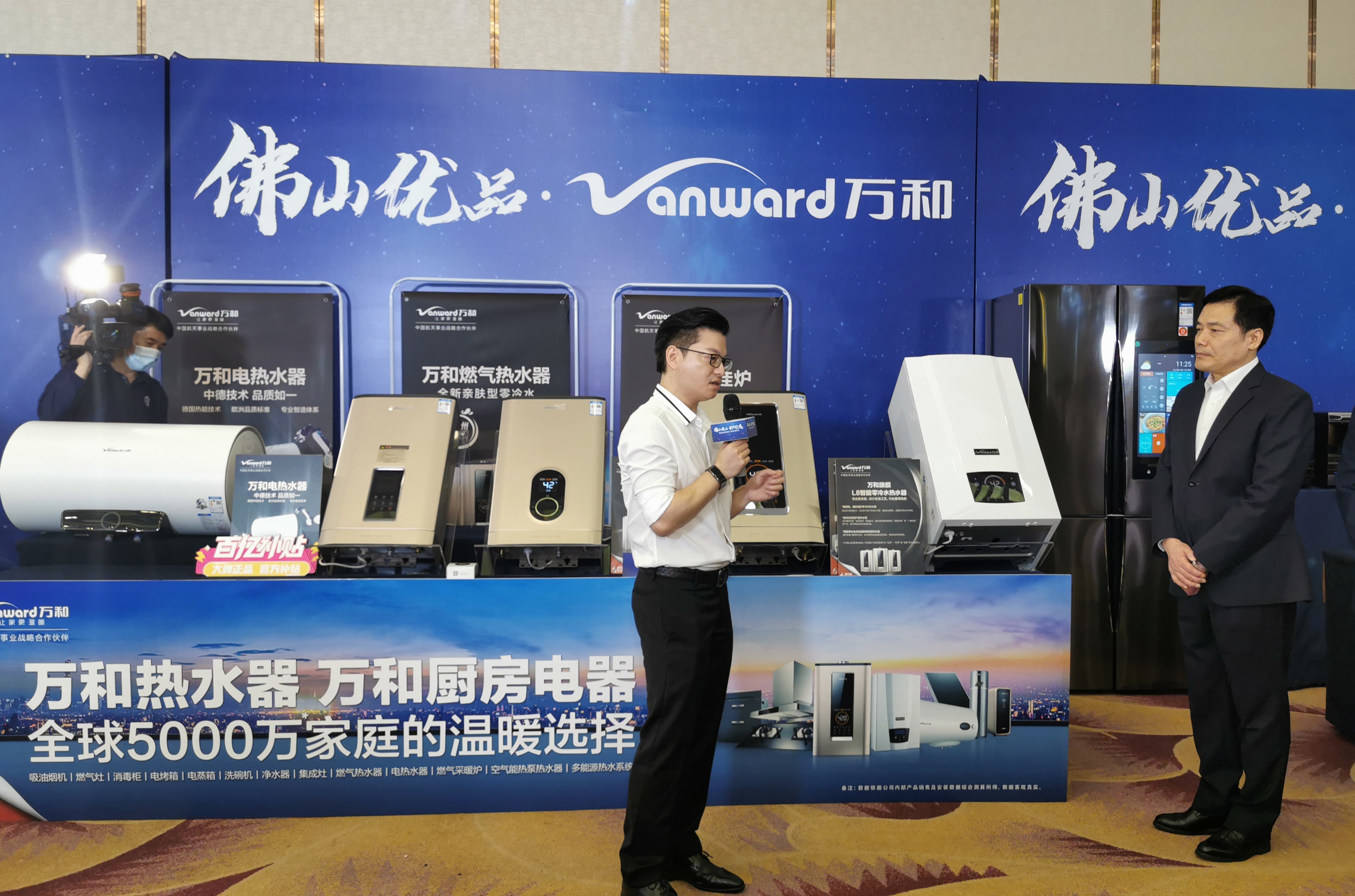 佛山市副市長喬羽(右)與萬和電氣總裁盧宇聰(左)向線上網友推薦萬和精品。