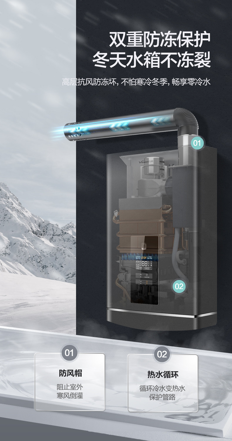 萬和LS5零冷水燃氣熱水器配有高性能防風帽,可有效阻止冷風倒灌,同時配有直流變頻水泵循環加熱系統,有效防止機器凍壞凍裂。而直流變頻鼓暖風、火排循環燃燒技術,更有效地避免了水箱凍裂的問題,即使是零下極端的環境,依舊能夠使用自如。