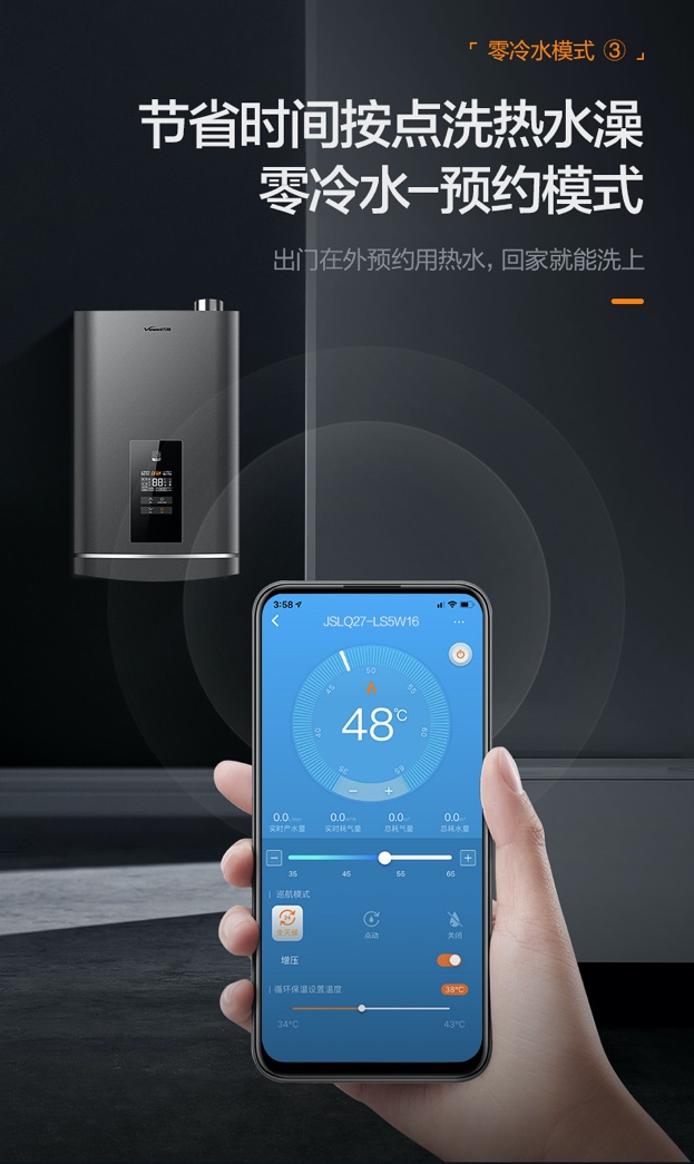 除了在能效上超過業內標準,該系列還有很多其他的硬核亮點。普通熱水器在使用時,會先流出一部分管道中余存的冷水,而萬和LS5增壓零冷水燃氣熱水器通過在熱水器中內置循環水泵,當熱水器檢測到回水管中水溫低于用戶所設置的保溫溫度時,即時啟動循環水泵回收水管中的冷水并進行加熱,直至達到保溫溫度,從而實現“花灑一開,熱水即來”,極大地提升了用戶的使用體驗,同時減少了水資源的浪費。