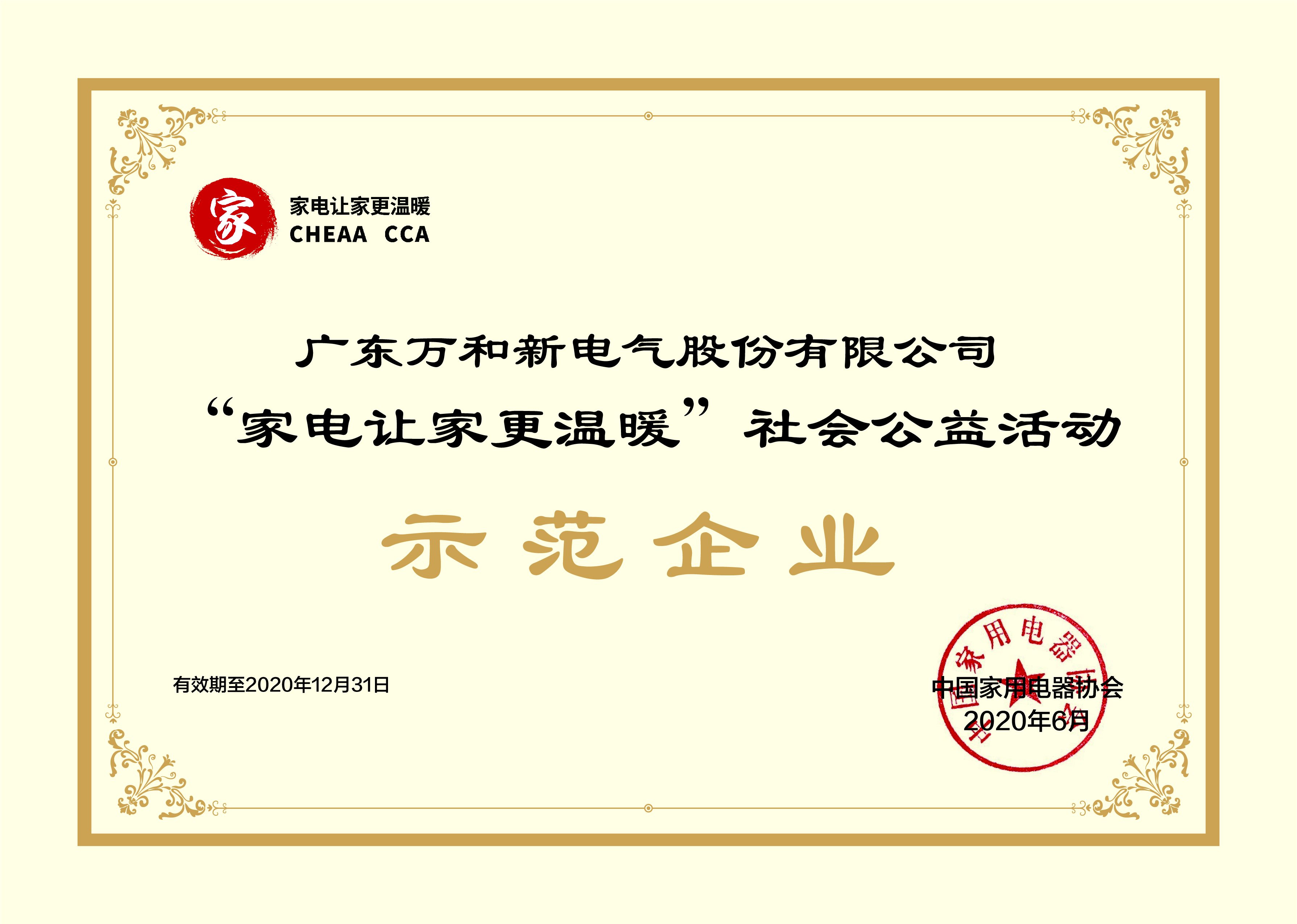 6月16日,中國家用電器協會聯合中國消費者協會發起的“家電讓家更溫暖”社會公益活動啟動儀式在線上舉行,中國家用電器協會理事長姜風、中國消費者協會副秘書長王振宇,中國家用電器協會副理事長徐東生等領導及部分家電企業和京東、國美等渠道商代表共同出席了啟動儀式。在本次活動上,廣東萬和新電氣股份有限公司入選“家電讓家更溫暖”社會公益活動示范企業。