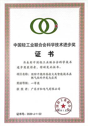 7月18日,中國輕工業聯合會(簡稱:中輕聯)會員大會舉行年度頒獎活動,由廣東萬和電氣有限公司(廣東萬和新電氣股份有限公司全資子公司)報送的“預防干燒傳感控火及智能技術在燃氣灶的開發與應用”項目獲頒“2020年度中國輕工業聯合會科技進步獎一等獎”。