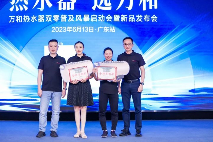 導購員是產品和市場溝通的橋梁,也是萬和的一線戰斗員,通過他們我們才能了解消費者對產品的滿意度,也能讓我們知道產品進步的方向。發布會上,還邀請了來自市場一線的兩位金牌導購員進行了經驗分享,暢談了他們各自在銷售燃氣熱水器和電熱水器工作經歷中的一些心得。兩位金牌導購都表示,做銷售首先要對自己的產品和品牌有信心,只要善于挖掘客戶需求,突出產品優勢,就能將萬和產品推薦給更多的消費者購買。賴育文總裁代表公司對他們的辛勤付出表示了感謝,并和深圳運營中心總經理郭勁超一起,為兩位金牌導購頒發了獎品。