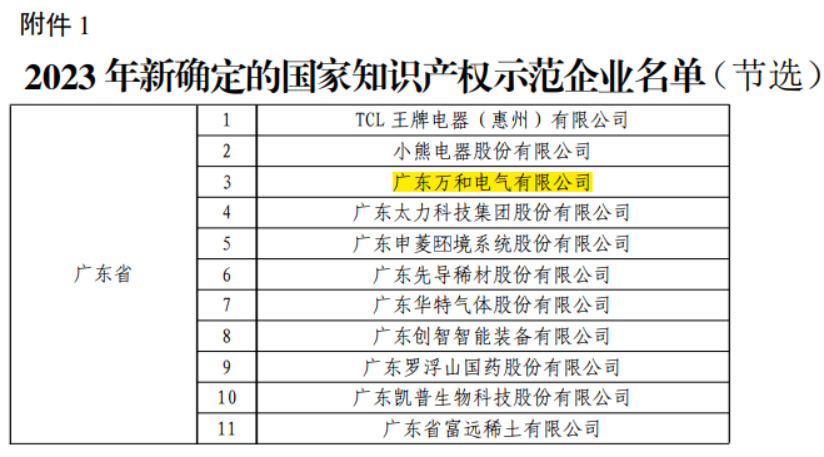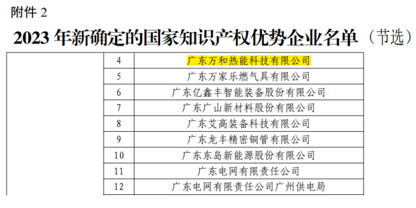 12月6日,國家知識產權局發布了“關于確定2023年新一批及通過復核的國家知識產權示范企業和優勢企業的通知”,廣東萬和新電氣股份有限公司旗下子公司廣東萬和電氣有限公司首次獲評國家知識產權示范企業,廣東萬和熱能科技有限公司首次獲評國家知識產權優勢企業。