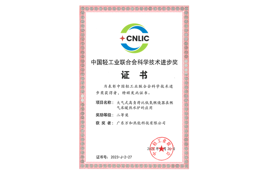 近日,中國輕工業聯合會五屆四次、中華全國手工業合作總社八屆四次理事會在廣元召開,會上公布了2023年度中國輕工業聯合會科學技術獲獎項目,由廣東萬和熱能科技有限公司(萬和電氣子公司)研發的科技項目“大氣式高負荷比低氮燃燒器在燃氣采暖熱水爐的應用”榮獲中國輕工業聯合會科學技術進步獎二等獎。