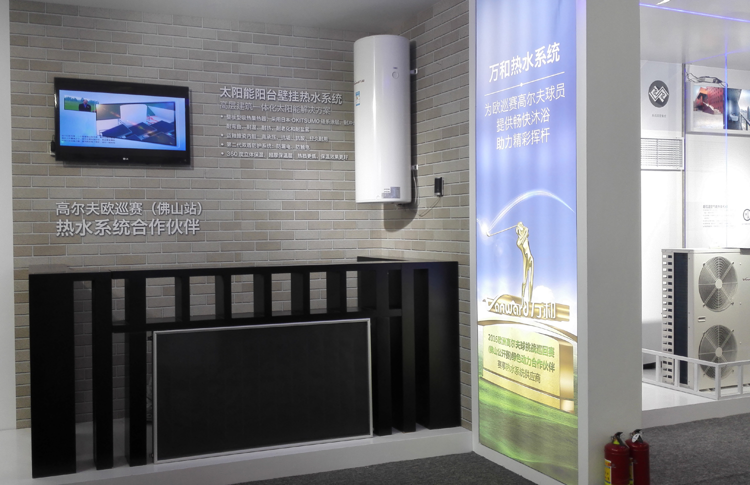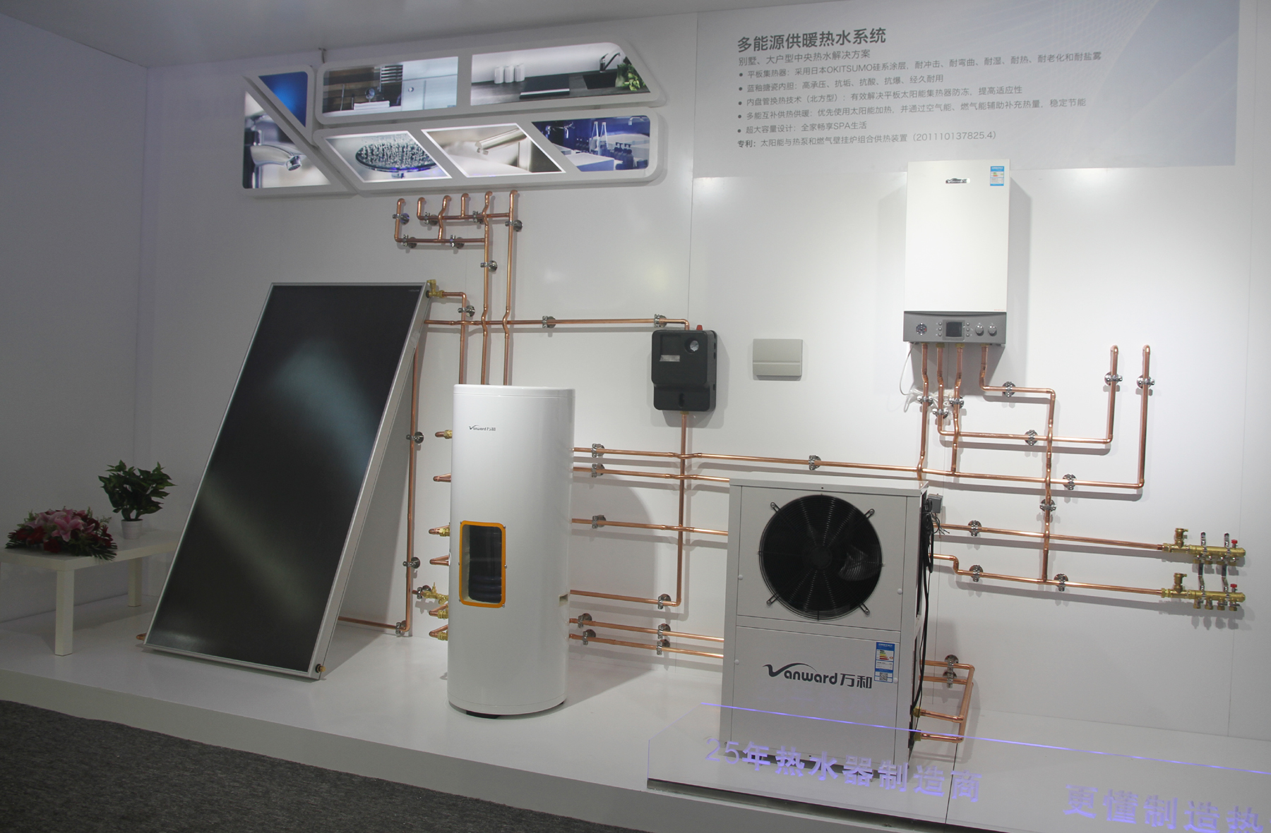 多能源供暖/熱水系統展示的主要是別墅、大戶型中央熱水解決方案。此外,萬和還展示了“高層建筑一體化太陽能解決方案”太陽能陽臺壁掛熱水系統,“空氣能地板采暖解決方案”冷暖兩用空氣能機組、“專門解決華北、東北地區熱水、采暖需求”的超低溫空氣能熱泵機組。