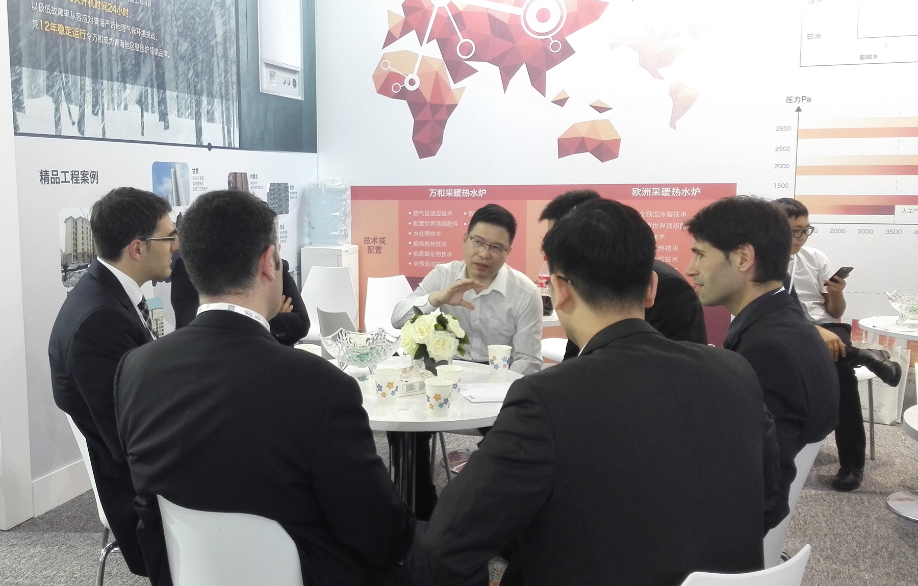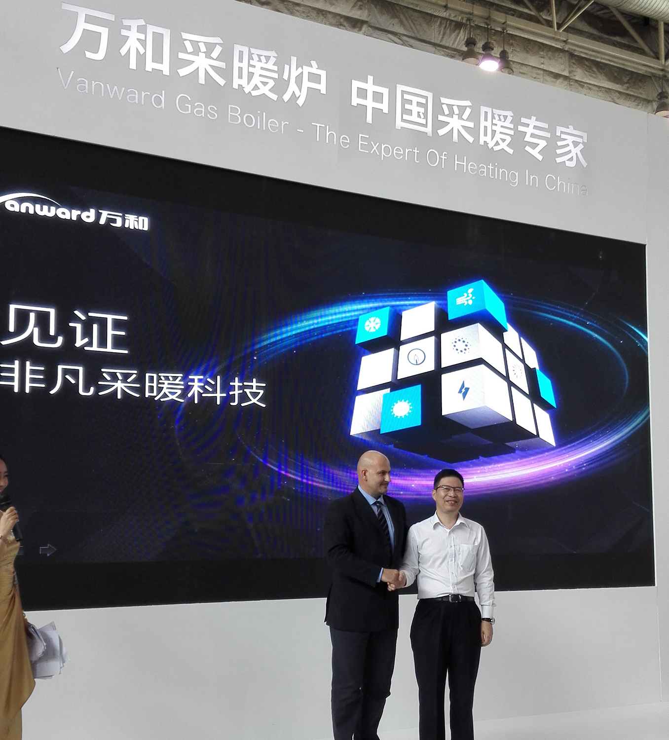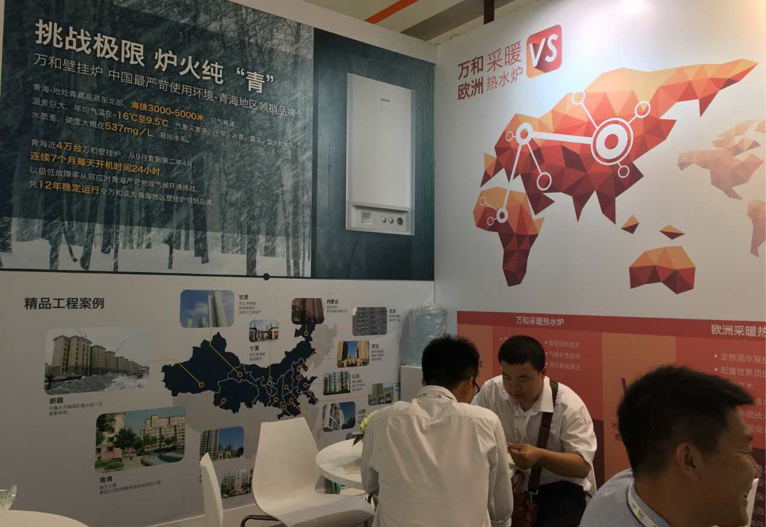 在萬和展位的巨幕電視墻上,滾動播出兩個經典案例,以鮮活的故事闡述了萬和在供熱采暖行業的顯著成就,也成為當天展會最為吸睛的焦點。