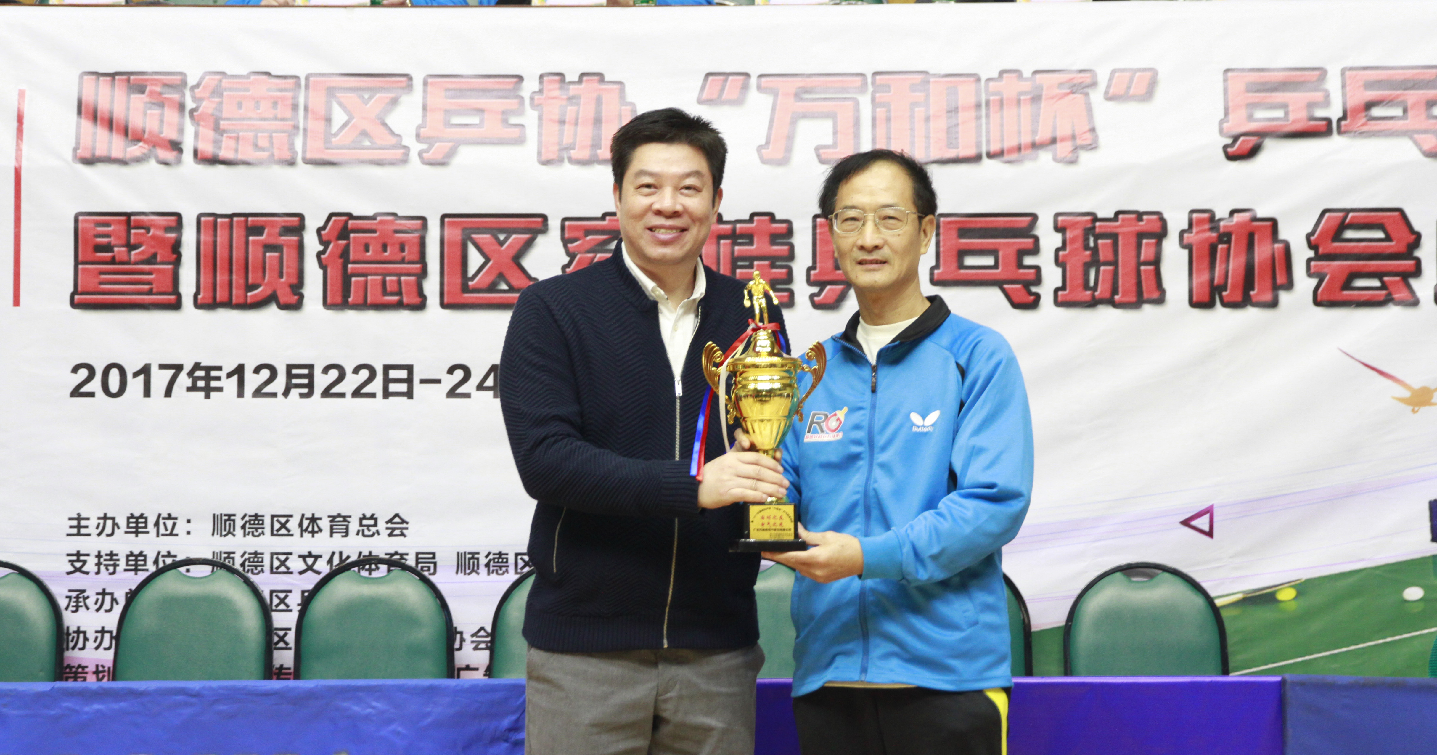 順德區乒乓球協會領導向盧楚隆董事長頒發紀念獎杯。