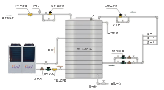 集中供暖熱泵采暖機組供暖工程系統圖,超低溫數碼渦旋噴氣增焓壓縮機,能適應-32℃至43℃環境溫度。機組支持模塊化控制,可十六臺主機并聯 為一模塊進行同一控制。可兼容風機盤管、暖氣片、地板采暖系統。地板采暖熱量由地板傳至房間內,溫度梯度分布均勻,溫差小,符合人體供暖需求, 既健康又舒適。