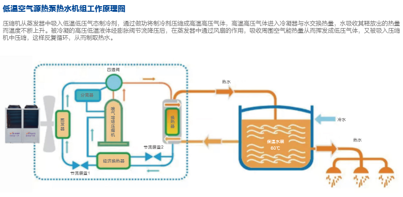 壓縮機從蒸發器中吸入低溫低壓氣態制冷劑,通過做功將制冷劑壓縮成高溫高壓氣體,高溫高壓氣體進入冷凝器與水交換熱量,水吸收其釋放出的熱量 而溫度不斷上升。被冷凝的高壓低溫液體經膨脹閥節流降壓后,在蒸發器中通過風扇的作用,吸收周圍空氣能熱量從而揮發成低壓氣體,又被吸入壓縮 機中壓縮,這樣反復循環,從而制取熱水。