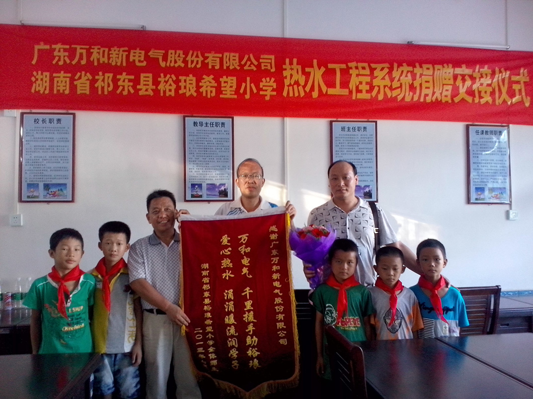 萬和作為生活熱水行業的領航者,時刻關注民生,踐行一個企業的社會責任。在充分了解了當地這些希望小學的情況后,對河北行唐縣南凹廣藝希望小學、湖南祁東縣裕瑯希望小學、安徽霍山縣落兒嶺鎮海爾希望學校進行了熱水系統的捐贈。